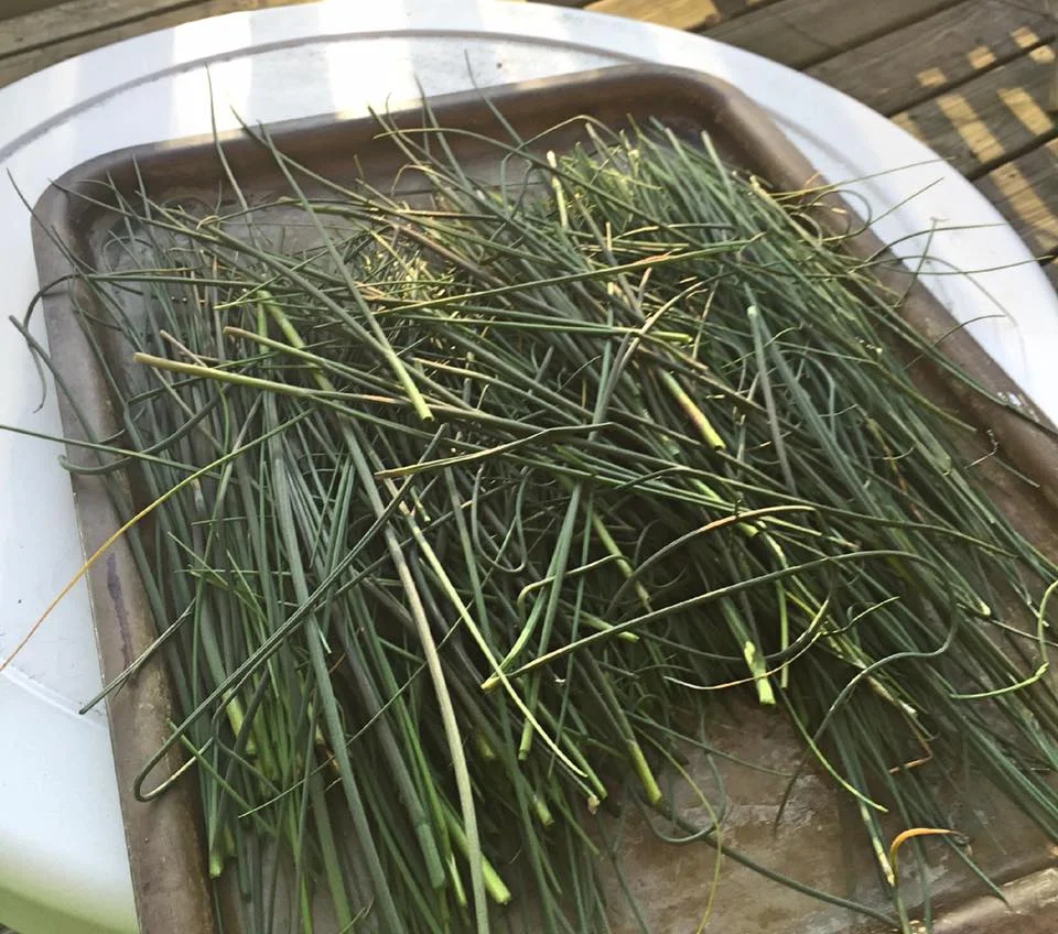 I picked through the scrawny ones and tossed to the chickens (who never mind the tasty castoffs), rinsed them and spread them over a sheet pan. A couple/three hours in the Aga's warming oven, and I have fresh dried chives to chop & dice & add to the spice drawer.