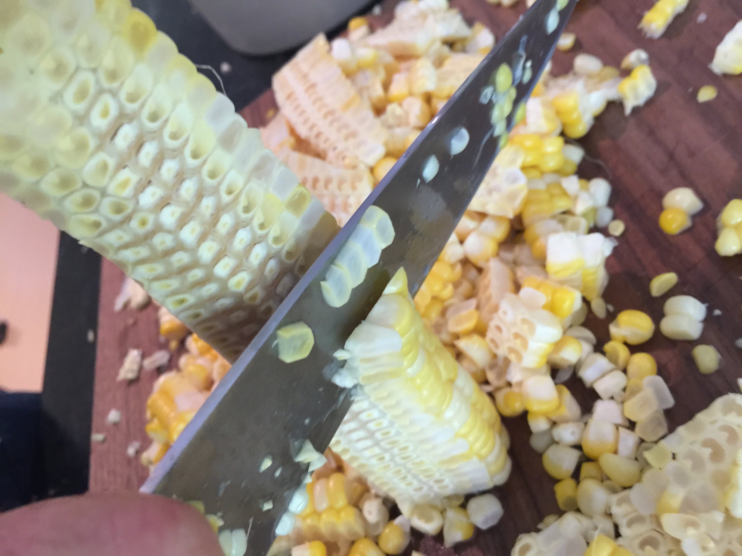 I scalded 15 ears of corn in boiling water for 2 minutes and set them aside on the counter to let them cool a bit before cutting the kernels off the cob. (The chickens get a double treat this afternoon of both the husks and the leftover cobs, which they go wild for).