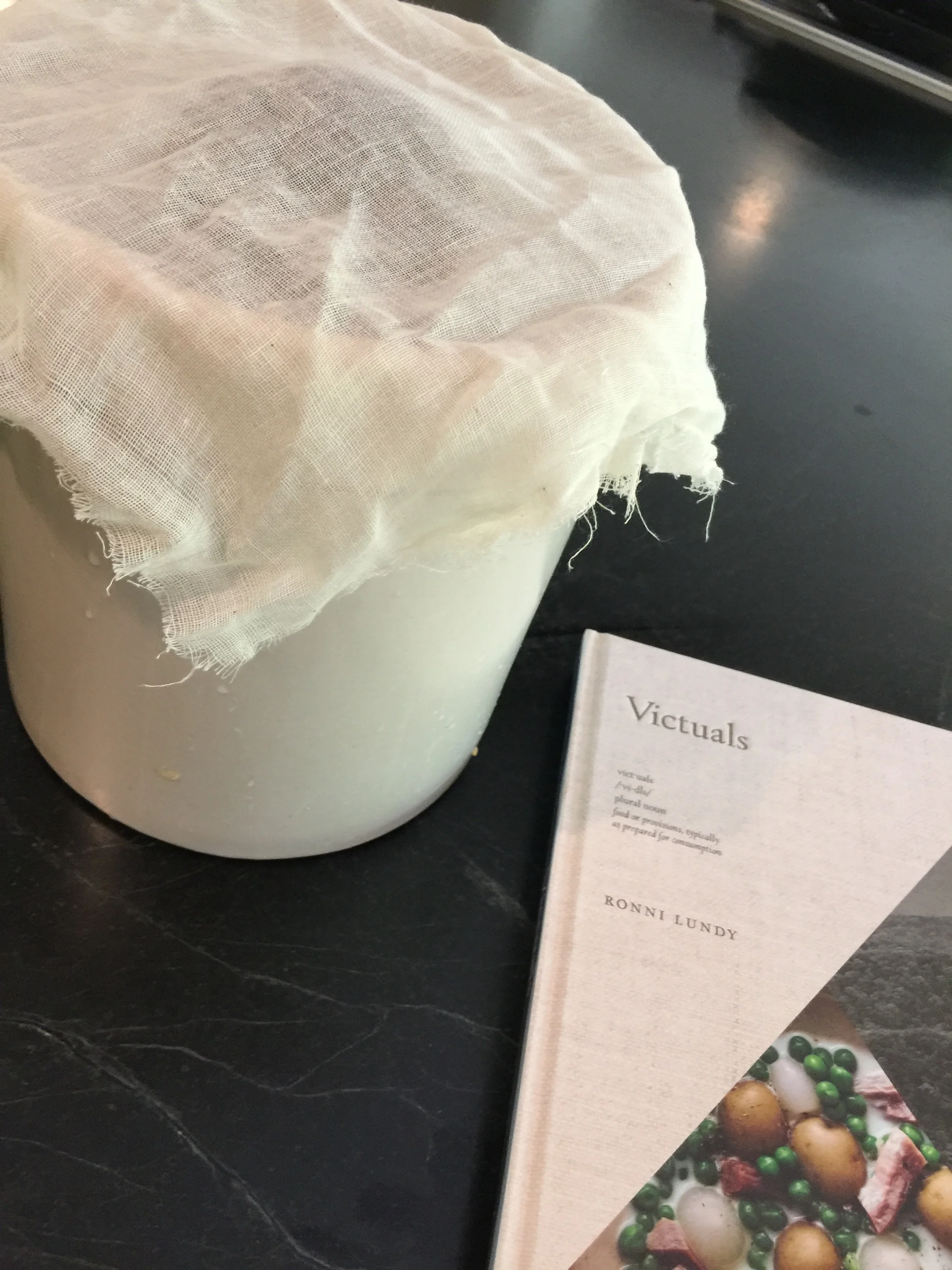 Slide a plate gently into the crock, and weight it down so that the corn stays submerged, and cover with cheesecloth. The crock is now resting in a cool, out of the way corner of the pantry for the next two weeks or so.