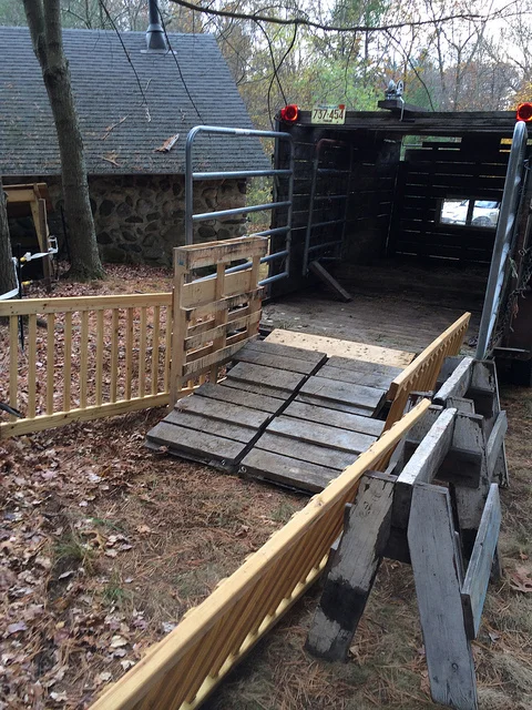 He brought his trailer over the day before we were transporting the pigs. I cut an area out of the fence, and put up a temporary chute onto the trailer. I moved their food up into the back of the trailer, and left them to it.