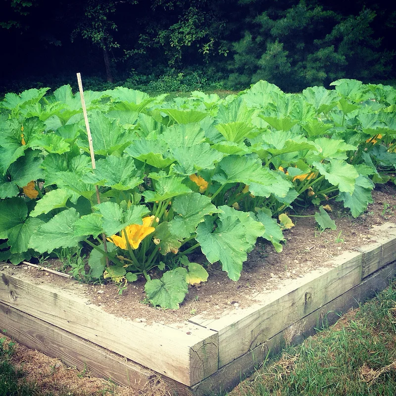 I have 3 different kinds of squash planted in this raised bed - the near rows are zucchini, and the back two rows are an acorn and hubbard squash. I always end up planting 2 or 3 more plants than I really should, forgetting how aggressively these things grow. But who cares. The chickens will eat anything we don't, and I always give in to the temptation to pinch off some of the blossoms as they show up to stuff and fry and eat. One of my favorite treats, and a rarity unless you grow your own squash, as the blossoms wilt so quickly.