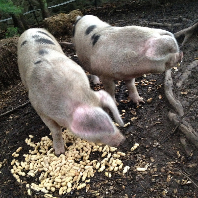 I throw my L.L. Bean boots on, and walk out to water the pigs and check their food and give them a scratch. I usually give them a small bucket of raw peanuts for a good morning treat. They love them, and happily munch away.