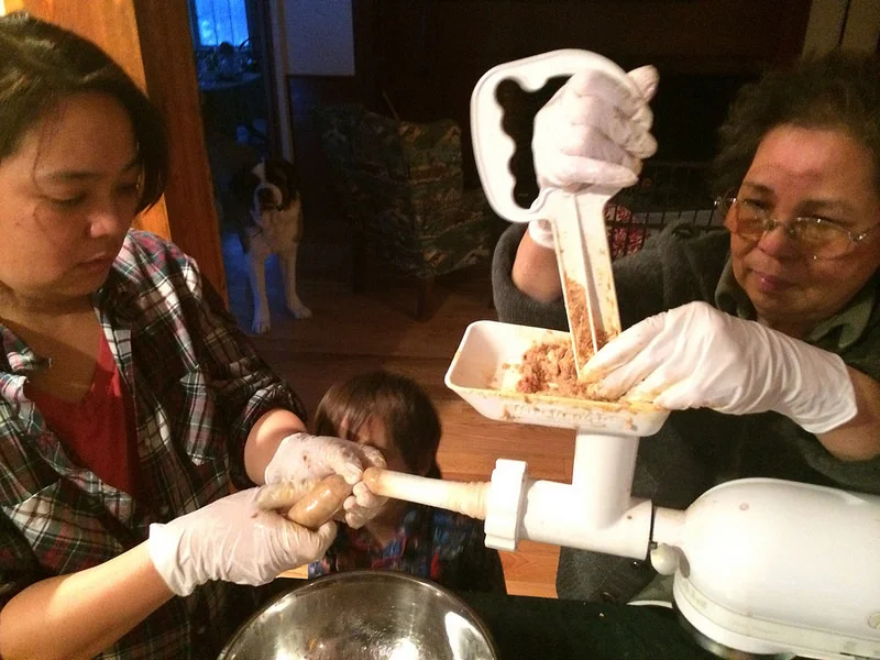 We started out making Longanisa - a Filipino sausage much like a Portuguese linguiça - sweet and tart and well seasoned. Grinding and stuffing the sausage was a whole family event, and took most of an afternoon, and many, many sausage jokes.