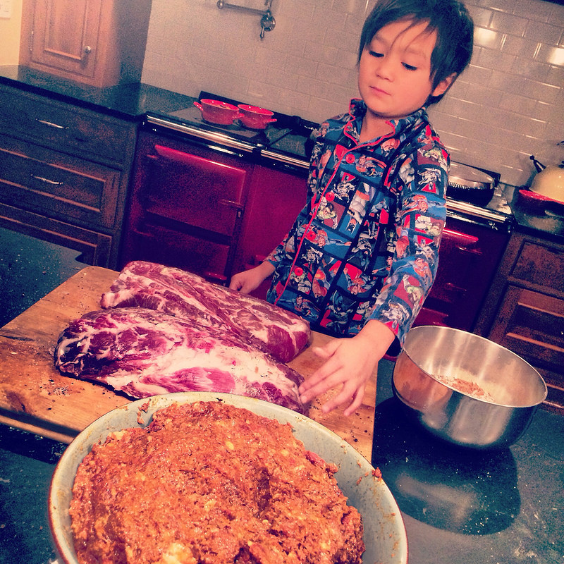 I laid the joints out and rubbed them down with a combination of salt, pepper, fennel, garlic, and a few crushed juniper berries.