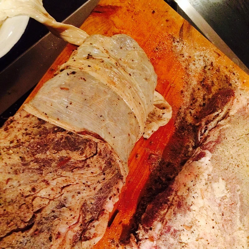 I'd never worked with a beef bung before. When you order one on Amazon, it comes in a plastic tube as a hardened, salty, fairly smelly little ball. An hour or so of soaking later, and you end up with a pliable, stretchy & tough natural casing that will wrap around a 6" diameter piece of meat. With a bit of love and effort.