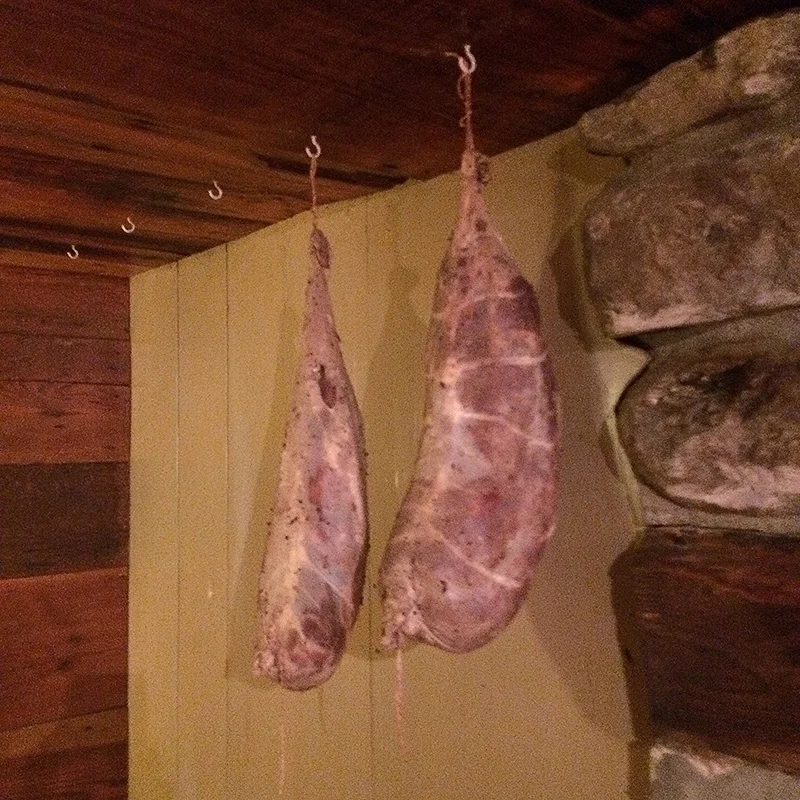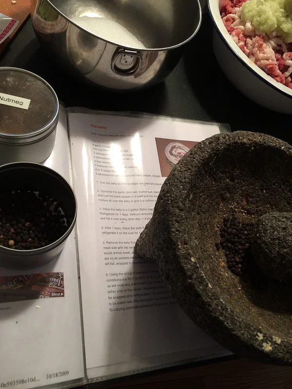 These get sealed in a food-saver vacuum bag with salt, a little brown sugar, garlic, rosemary, and pepper, and a couple of those crushed juniper berries and put into the fridge for a week or so before I'll roll them and hang them. to cure. Again - 6 or 7 weeks, and I'll end up with pancetta that'll blow your mind.