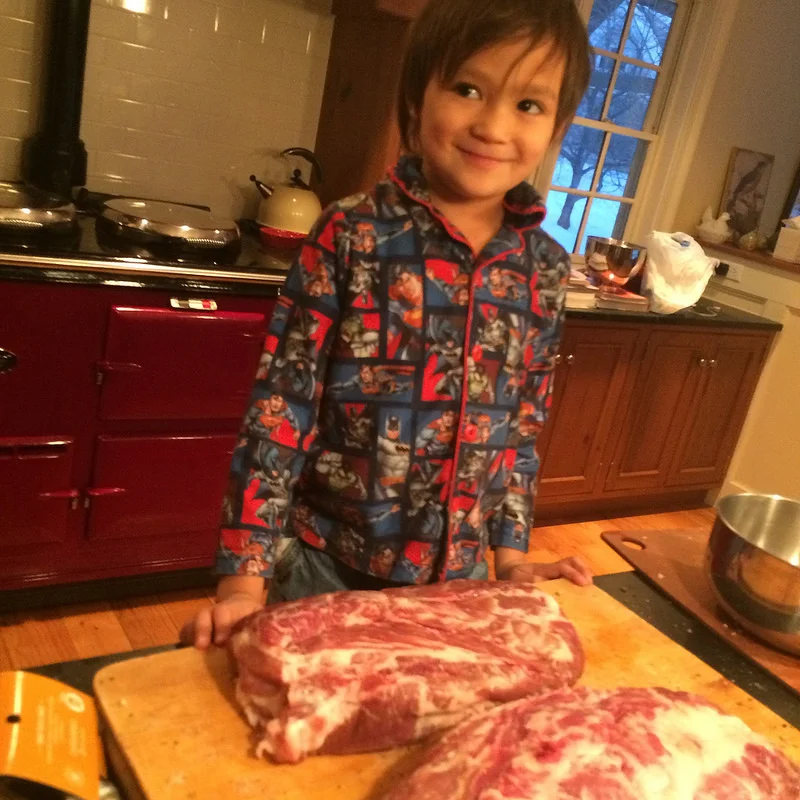 I also had pulled out two beautiful joints that the butcher had set aside for coppa. I've never made coppa before, but after describing the basic cuts I wanted to make sure we got (plenty of back bacon, three prosciuttos, etc), I told Maureen, the awesome partner at our butcher to just cut the pig how she felt best.