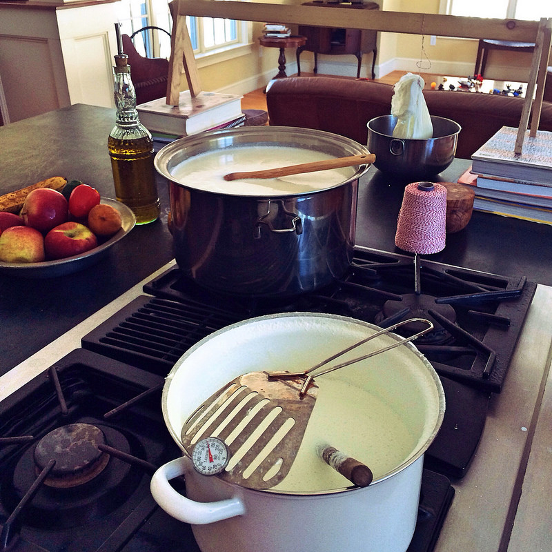 The larger pot is my cheddar, resting and waiting to curdle. In the smaller, white pot is goat's milk. The first batch of chèvre I made is hanging on the rack in the background.