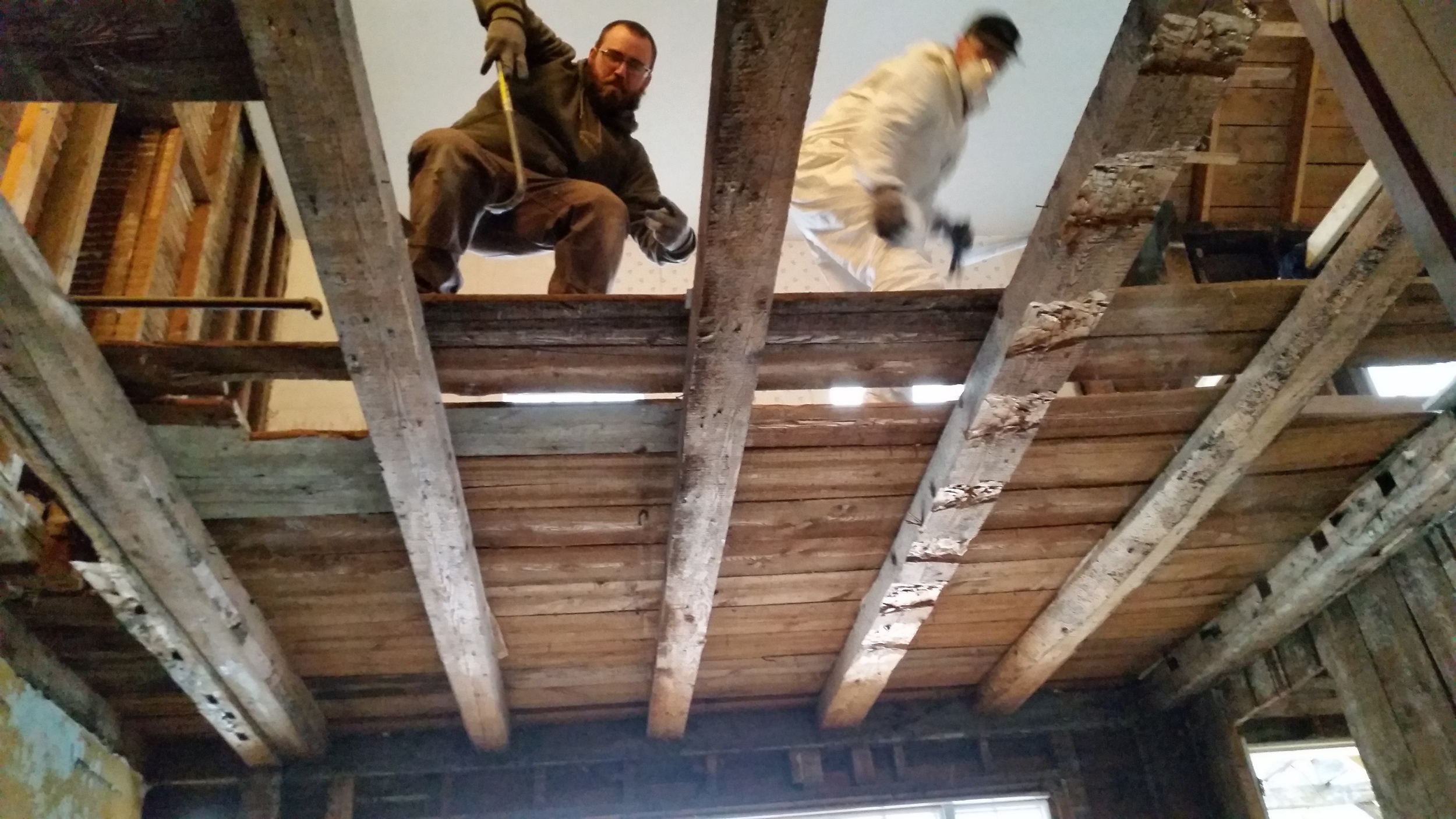 We could tell that these had been re-assembled, as most of the beams had been hammered in at an toe-nail angle with more modern nails. Many of the beams were twisted on their sides to provide a few extra inches of headroom in the 'cozy' room below (I had named it the hobbit kitchen, because of the low ceilings). And as you can see in the photo above, the spacing was oh-so-definitely-NOT up to code. The whole ceiling had a kind of 'springy' effect that was mildly alarming to the building inspector.