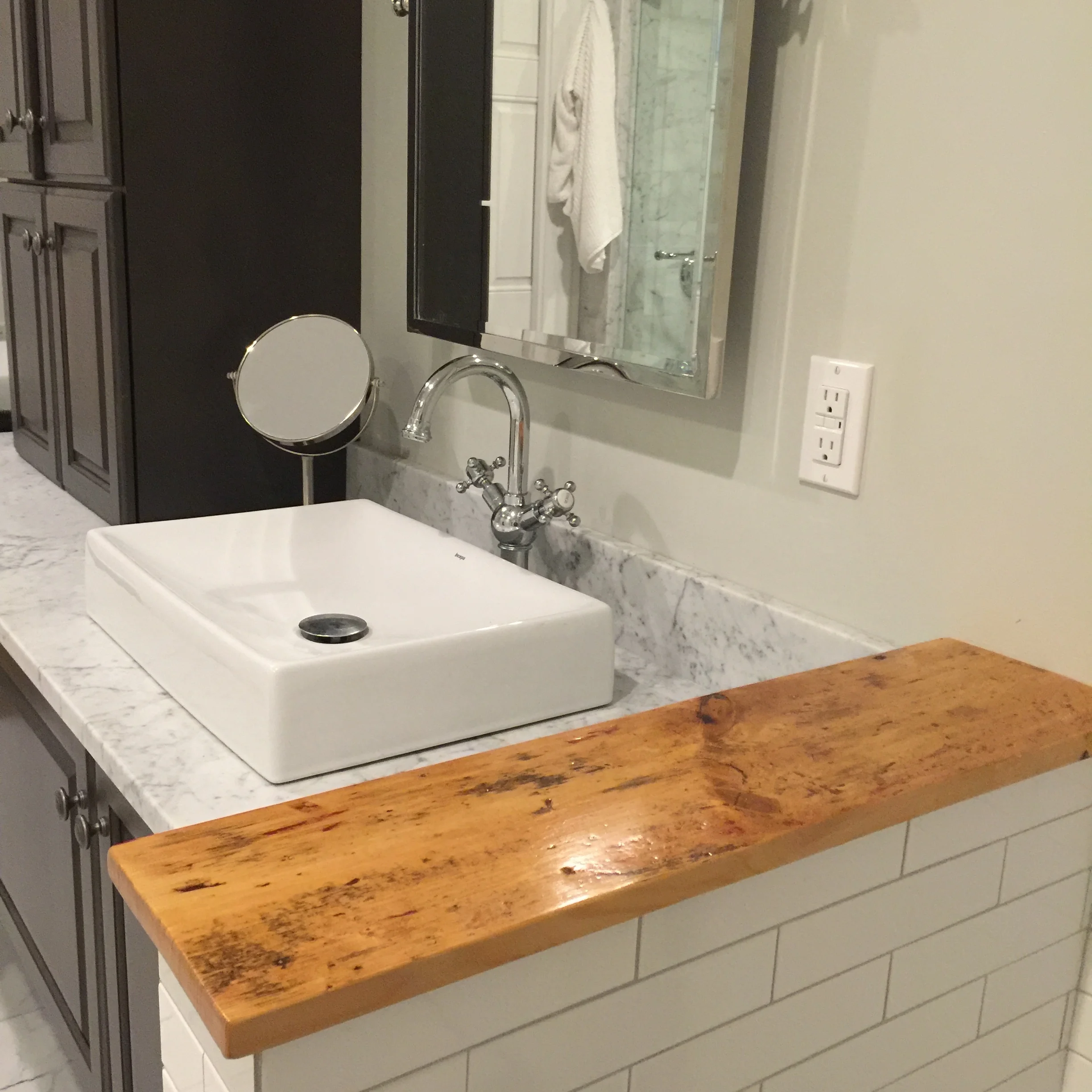 The door to the meat room is made from internal wall planking. The kid's sink counter is made from similar material. The counter on the built in kitchen hutch is all reclaimed from sub flooring. Even the small divide between the sinks and the toilet area in the master bath is made from a reclaimed piece of scrap from the original house, and may (oddly) be my single favorite piece of reclamation in the house.