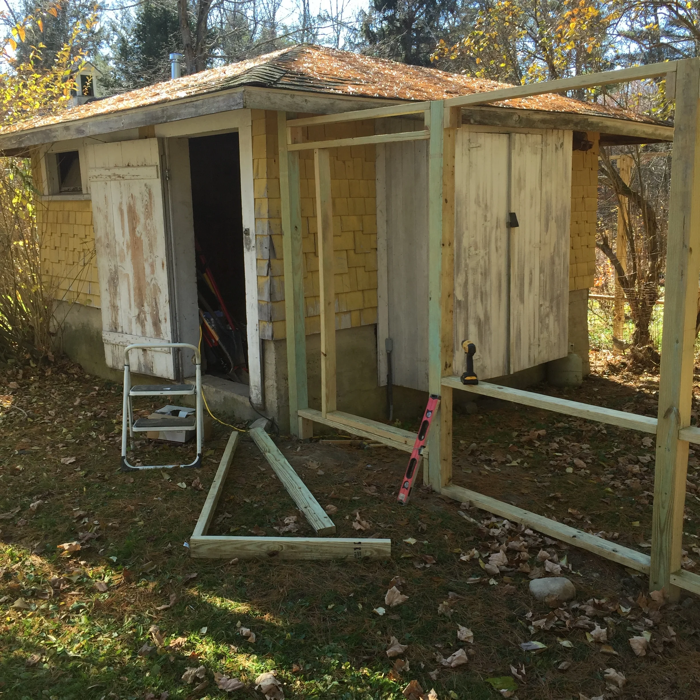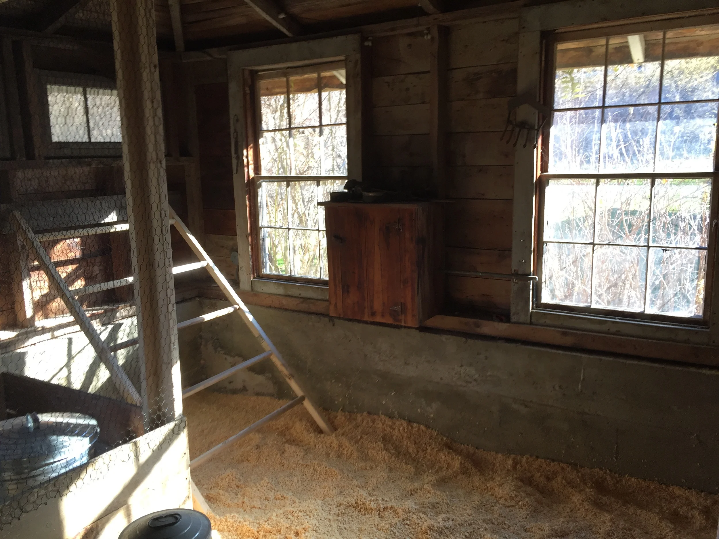 The pump house is great in almost every way for this. It's big and roomy. (12'x12'). Well lit with several windows. Has electricity run to it already. Has a concrete knee wall (hard for predators to beat). And is pretty reasonably sited on the property (important in a snowy winter).  Plus, it's right across from the greenhouse door - so I can shoo the chickens in there during the winter if I choose, a trick I've heard from old timers up here.