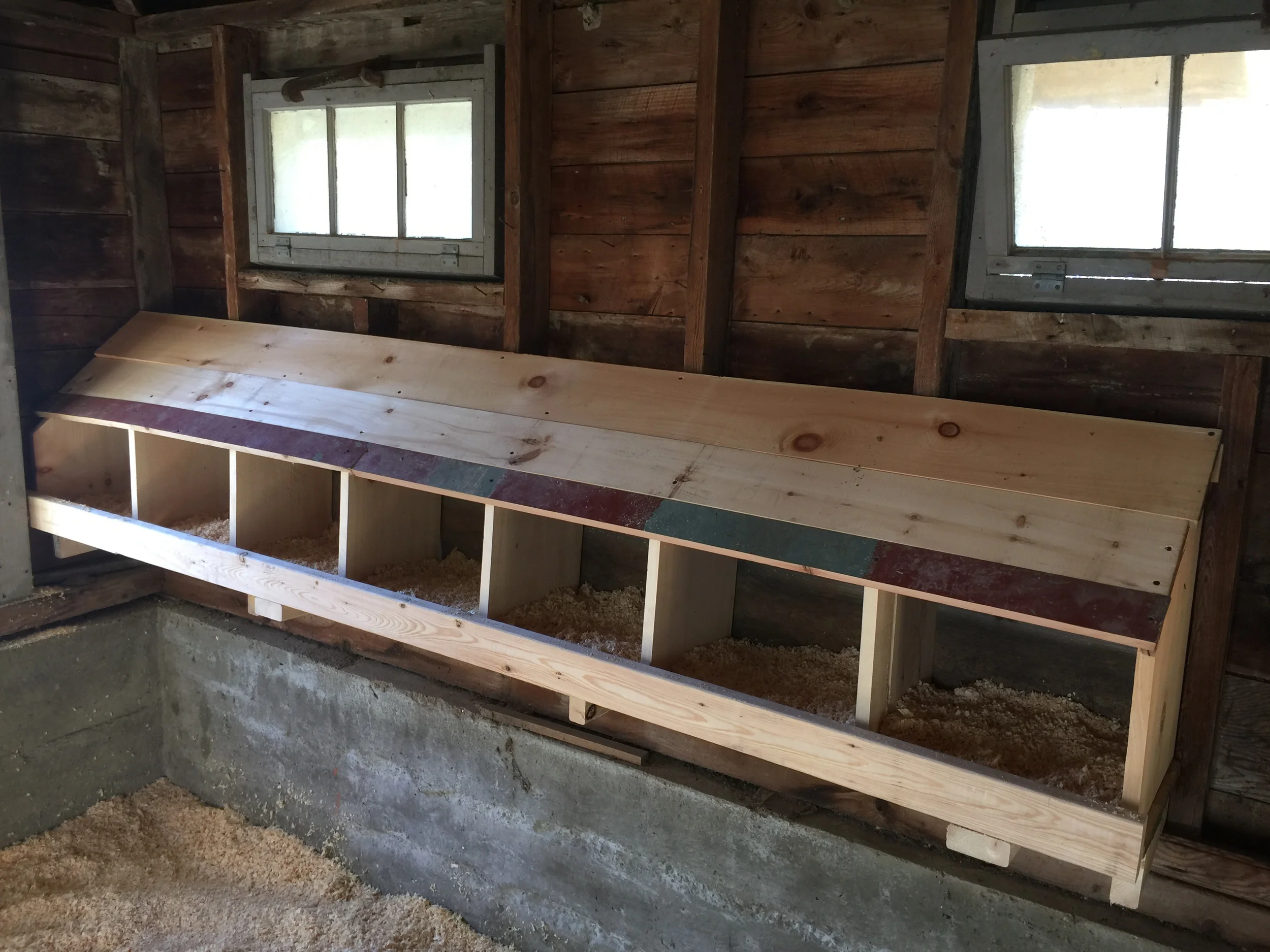 Two, the roosting bar in front of the nesting boxes (a simple 2"x4" runner) is offset slightly from the front of the nesting boxes.