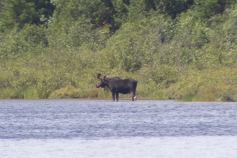 I had a moment of '...probably right next to the bear you spotted earlier' until I looked up, and saw a 7 foot bull moose standing in the water at the end of the lake. Sure as shit. Our first moose. (Not just this trip. This is our first moose spotting since moving to Maine).