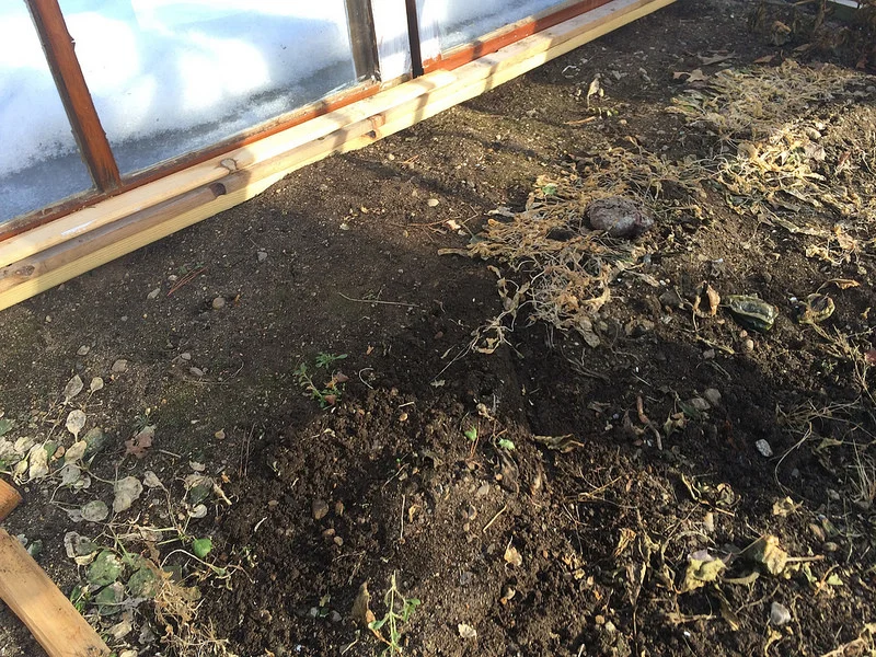 I built it out of reclaimed wooden-framed windows, on the end of one of the raised beds to allow the soil to warm up quicker. And to hopefully give me a place to start a few early crops. It had been covered by snow for weeks and months, but the few recent sunny days had left it clear.