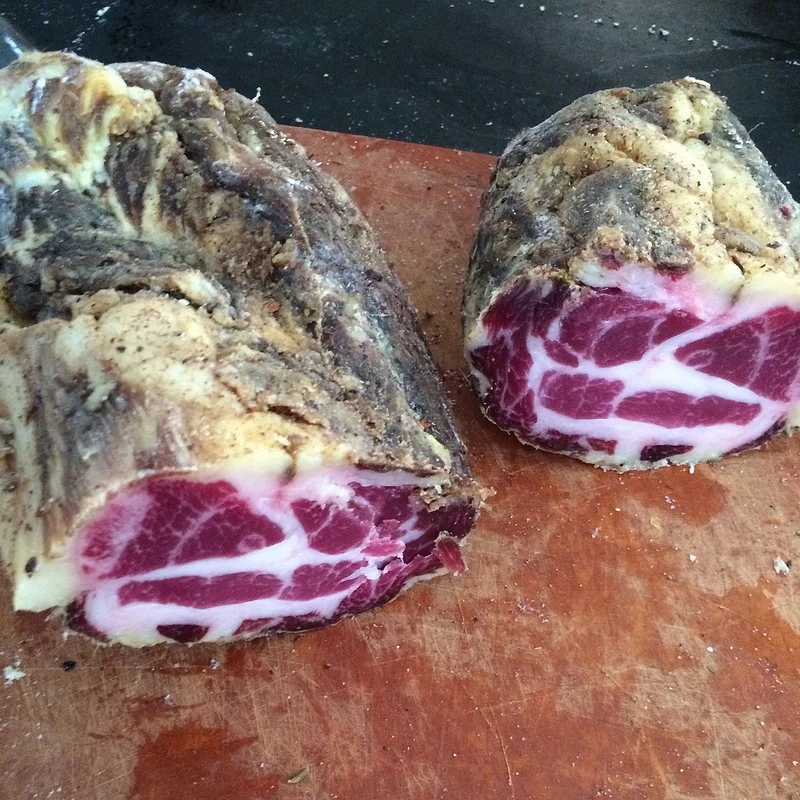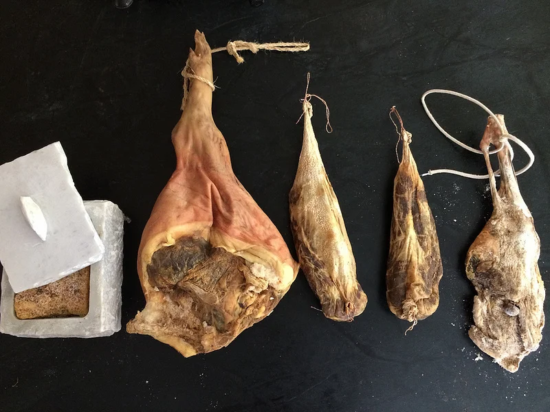 From left to right, that's lardo di colannata (rich, pure pork fat cured in a marble box), a classic prosciutto, two coppa and a lamb prosciutto.  The prosciutto had been curing for two years in my cellar.