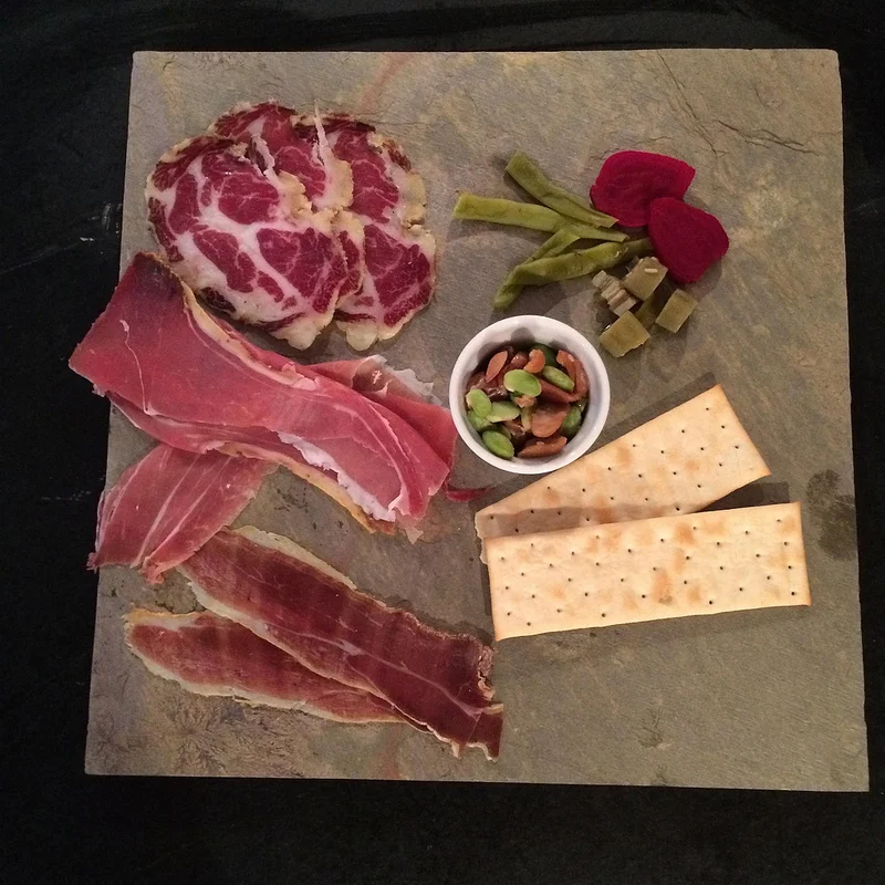 Our first course was a sampling of charcuterie, served along side some fresh pickled vegetables from our garden - beets, okra & green beans -  and a boiled peanut & tahini edamame.