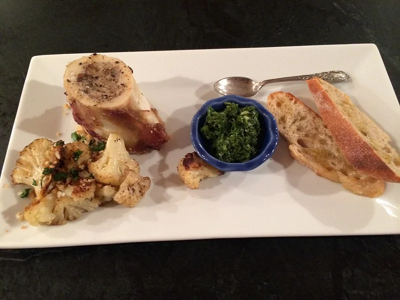 As an interlude, we had prepared another one of our favorite treats - roast beef bone marrow. served alongside a bright, citrusy gremolata and roast cauliflower - it's something that I order pretty much anytime I find it on a menu.