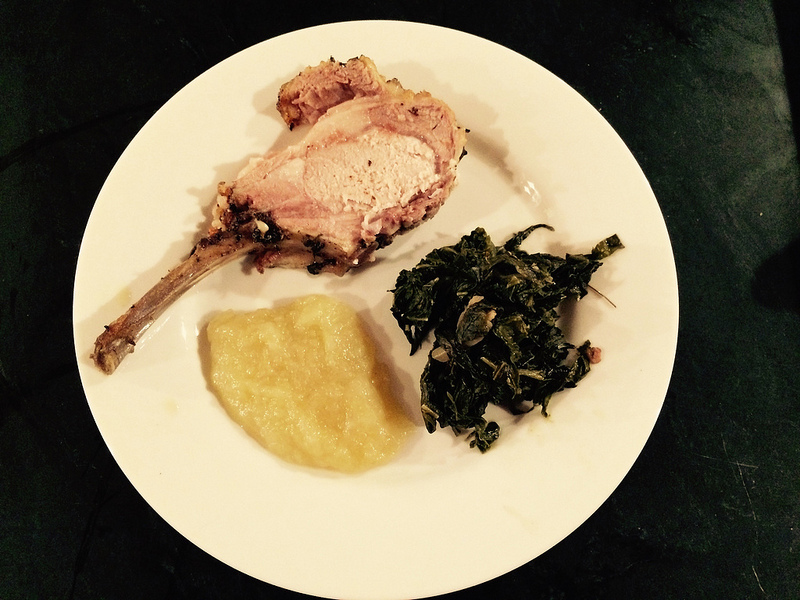 As our main, we had set aside a crown roast of pork from our backyard-raised pigs (it was Honeydew, to be specific). It was lovely and rich, and set off by collard greens harvest from our garden, and apple sauce we made from the last batch of apples we'd pick from our house in Massachusetts.