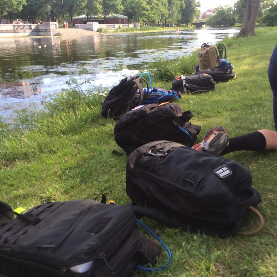 And we hiked. Through the city of Boston, shouldering our gear, making pedestrians and cars alike turn and gawk. Every couple of hours, we'd pause and do more group PT. While we hiked, Cadre Mike would get creative and find fun things to fill our time.