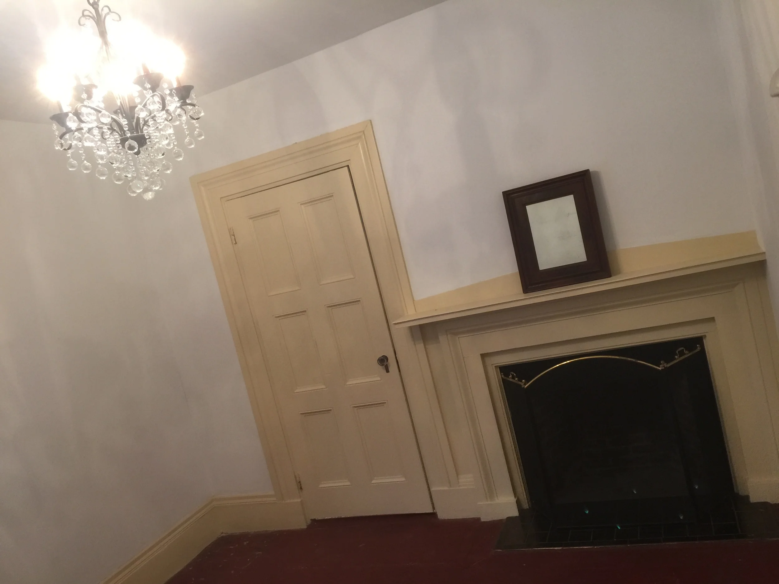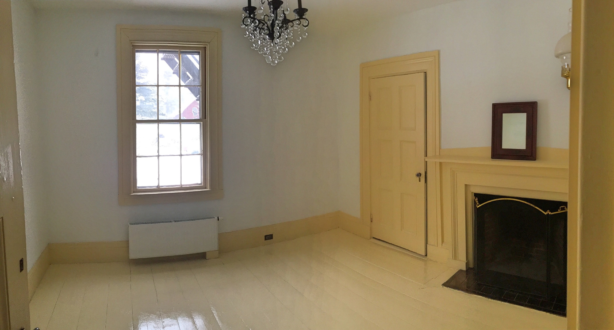 It's hard to say what or how it was used. It's got a fireplace (because all the original rooms have fireplaces. It's Maine. And winters are long and cold here).  And I added a crazy complicated bauble-filled chandelier when we moved in. Because the exiting light fixture would throw the occasional spark when it was turned on. Which seemed like a bad thing.