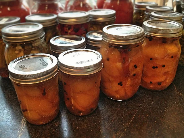 4. Pack the fruit into sterilized canning jars, and pour over the warm syrup from the pan. Seal and put aside to finish.