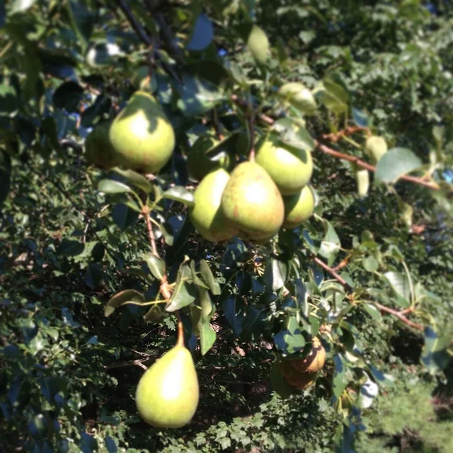 I'm not sure of the variety. They're as small as a Seckel. But they're green turning russet like a Bosc. Not that it matters. I was so excited to see both this and the apple tree producing that we got to picking.