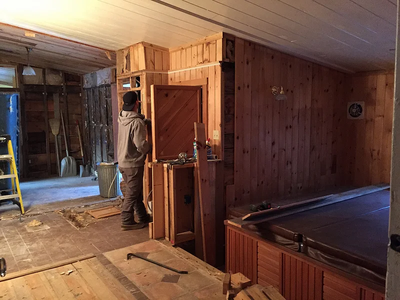 In fact, this whole area (which used to be two rooms, the bathroom and mudroom. See where the shovels are leaned up against the wall? That was the mudroom) was a series of lean-tos-turned-house. When we pulled all of this out and looked at what we had left, these rooms were built on 4 different levels. (note the hot tub in its sunken position. That was a knee-shattering-and-mind-boggling 3 feet drop from the floor above.)