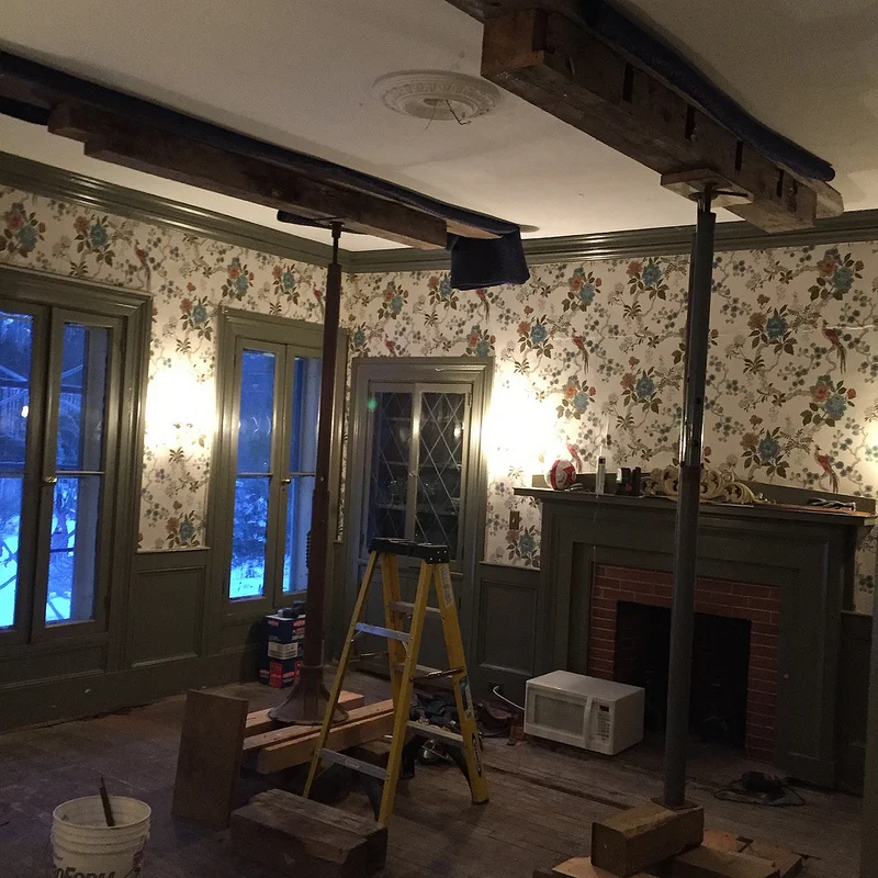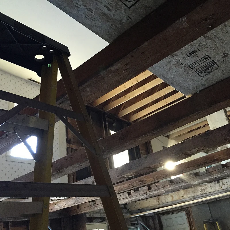 Old stuff. New stuff. Sistered stuff. With some support that will be hidden away once it it's all put back together. An an unfortunate amount of wallpaper that needs to be removed and destroyed.
