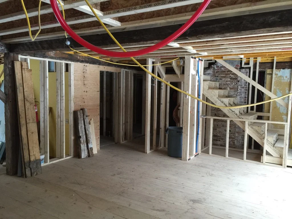 The whole floor you're looking at is new. It's about 5 inches higher than it used to be. And about 100x more level. It's just sub floor - and it's not plywood. Because if you are looking up at it from the basement, you don't want to see modern construction in a 1780's farmhouse. So it's all wide pine boards. On top of which we will put the actual floor (which will also be wide pine boards).  I think I mentioned that the crew that we're working with (Morse & Doak) is kind of fanatical for these kinds of details. Which helps. Because when they ask me questions like "What kind of lights would you like?" I say things like "um. Electric?" and when they ask, "Where do you want them?" I respond with things like "I was thinking in the ceiling. Probably."